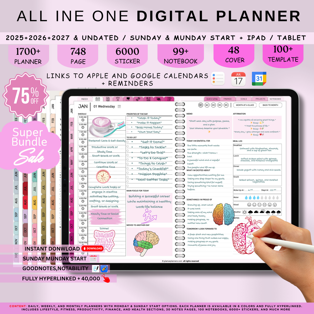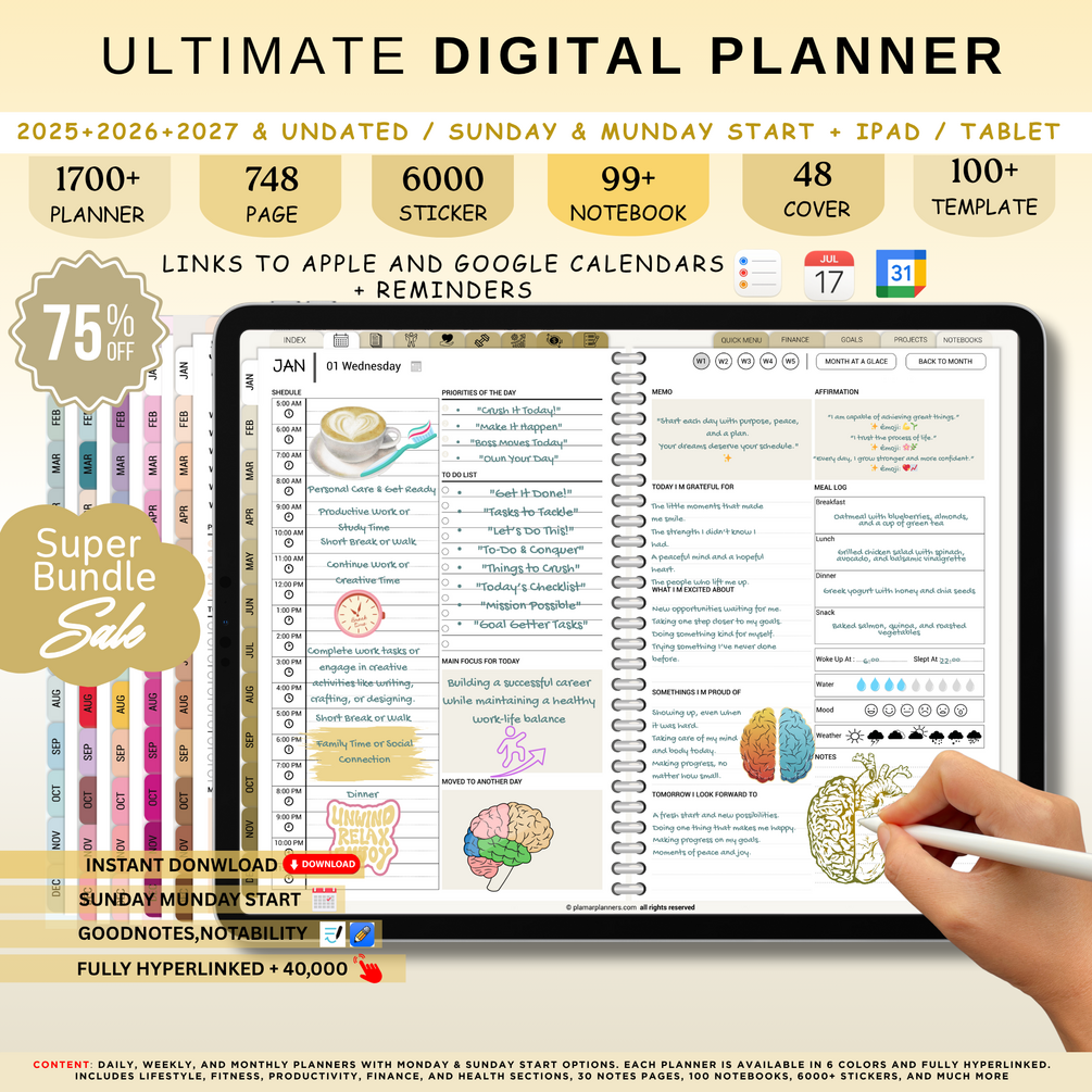 Digital Planner 2025-2026-2027 & Undated | Goodnotes, iPad, Notability | Daily, Weekly, Monthly Planner | Digital Stickers & Apple Google Calendar