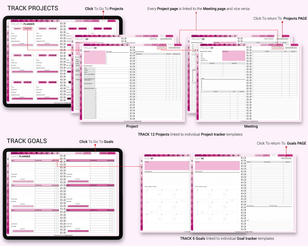 To Do List / Project Planner / Meeting Planner / Smart Goal Planner / Goal Planner / Time Planner / Daily Routine / Quarterly Plan / Pomodord Tracker / Client Appointement / Vision Board