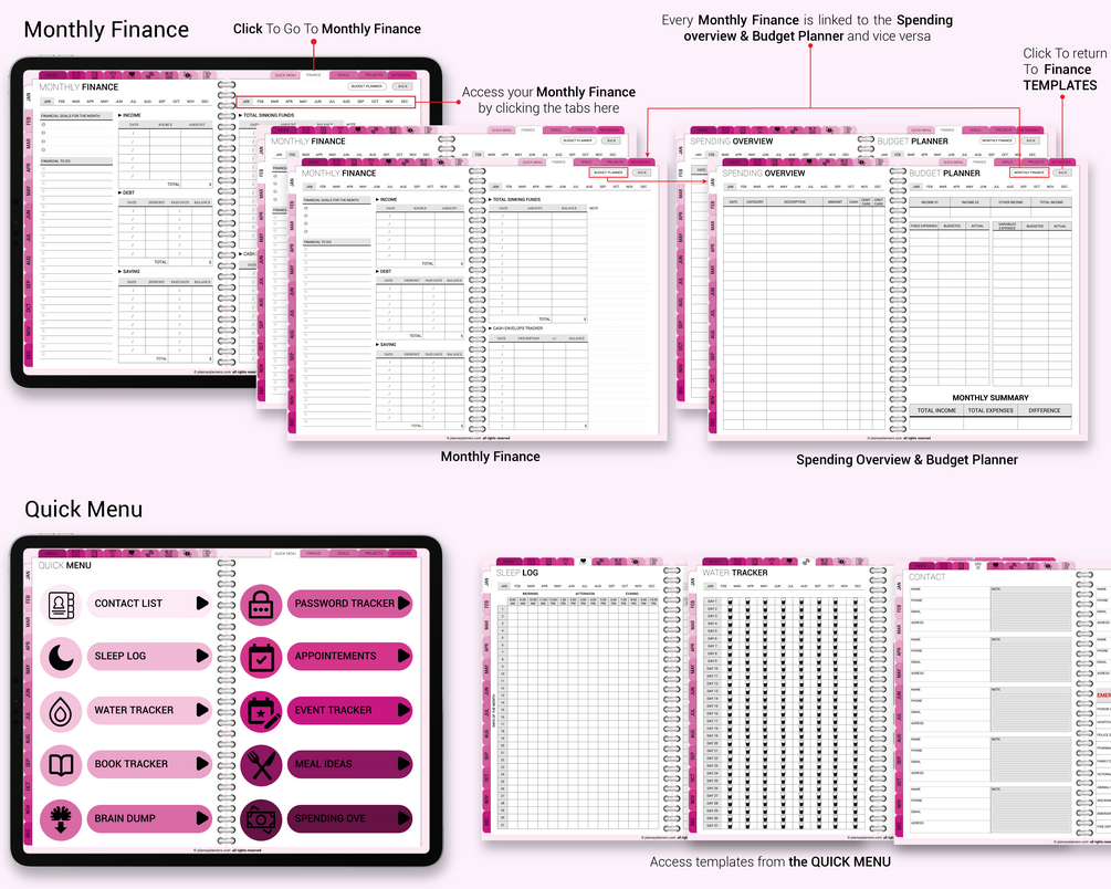 Purchase Tracker / Wish List / Subscription Tracker / Afterpay Tracker / Monthly Finance / Spending Overview / Budget Planner / Yearly Finance Overview / No Spend Challenge / Debt Snowball Tracker / Bank Account / Saving Tracker / Bill Payment / Sinking Funds