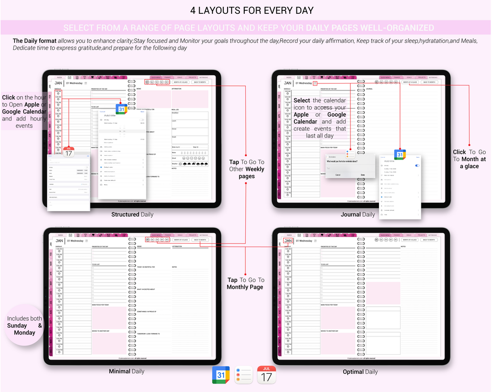 ✵ 6000 Digital planners with various Daily and Weekly layouts in both Sunday and Monday starts