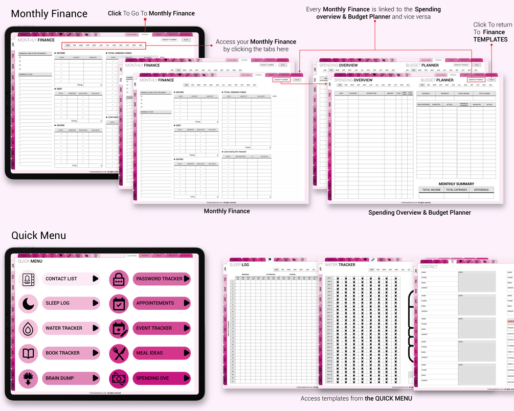 Purchase Tracker / Wish List / Subscription Tracker / Afterpay Tracker / Monthly Finance / Spending Overview / Budget Planner / Yearly Finance Overview / No Spend Challenge / Debt Snowball Tracker / Bank Account / Saving Tracker / Bill Payment / Sinking Funds