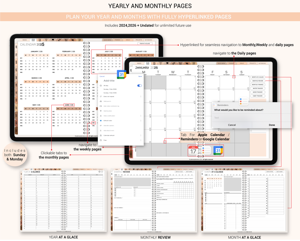 Our Digital Planner bundle is designed to enhance your productivity and help you reach your goals while maintaining balance in your life. Featuring a streamlined layout with an intuitive network of embedded hyperlinks and interactive buttons, this planner offers a smooth and enjoyable user experience on iPad, GoodNotes, and Notability. Personalize your planner to fit your unique style and needs, and easily update your design whenever you like. Discover why this planner is a favorite for achieving better organization and productivity!