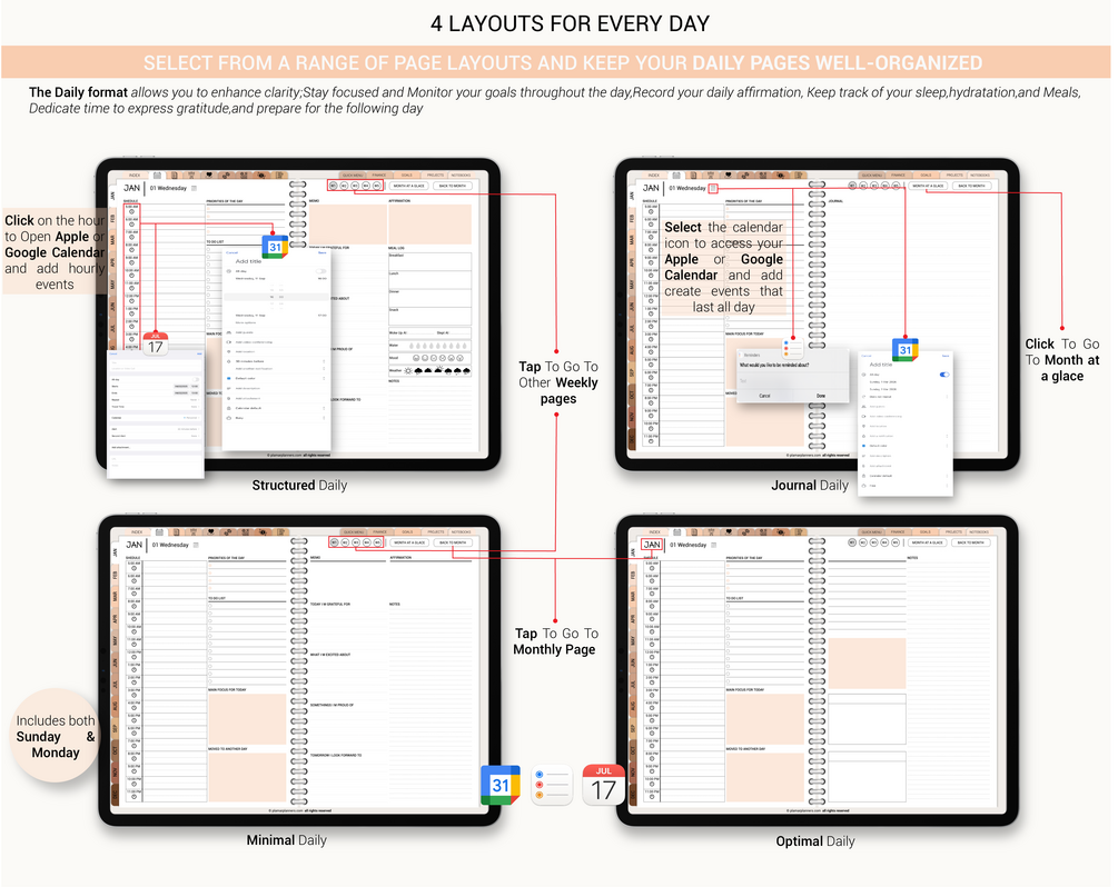 ✵ 6000 Digital planners with various Daily and Weekly layouts in both Sunday and Monday starts