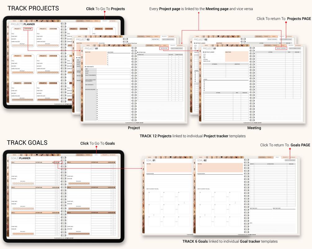 Our Digital Planner bundle is designed to enhance your productivity and help you reach your goals while maintaining balance in your life. Featuring a streamlined layout with an intuitive network of embedded hyperlinks and interactive buttons, this planner offers a smooth and enjoyable user experience on iPad, GoodNotes, and Notability. Personalize your planner to fit your unique style and needs, and easily update your design whenever you like. Discover why this planner is a favorite for achieving better organization and productivity!