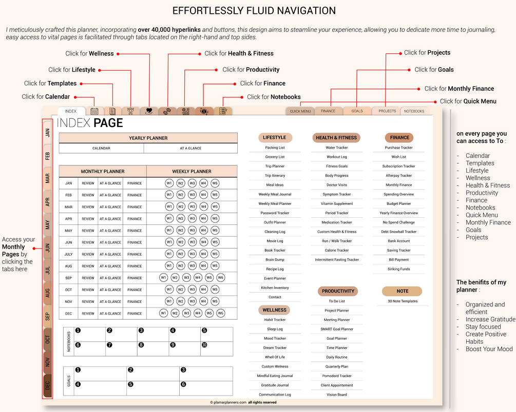 β’ π Hyperlinked Pages: Navigate quickly through over 40,000 interactive links between daily, weekly, monthly, budget, wellness, and project pages.