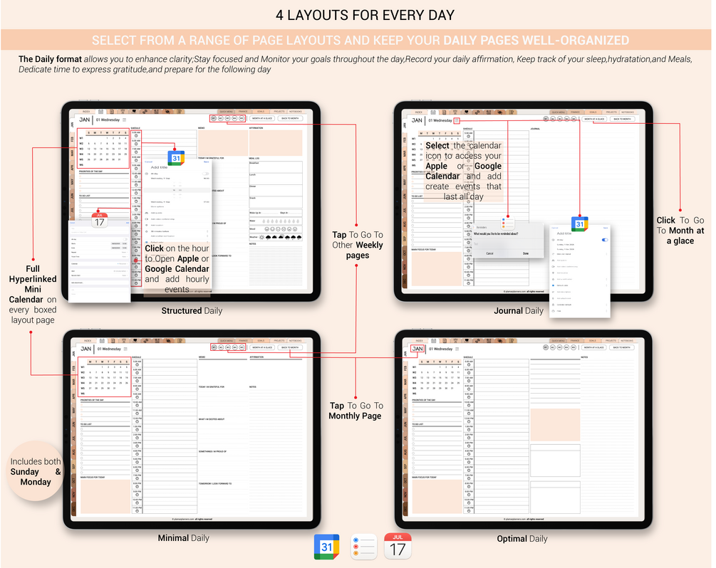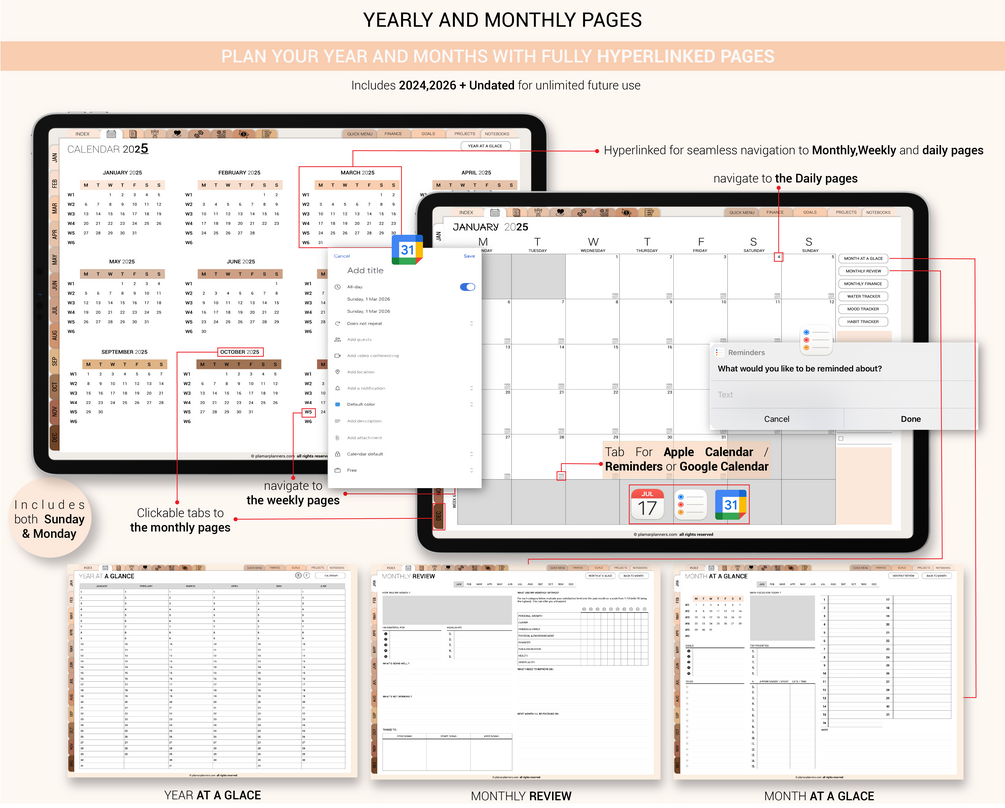 Apple Calendar & Reminders Integration: Sync your digital planner with Apple Calendar and Reminders to keep your schedule, tasks, and goals aligned across your devices.